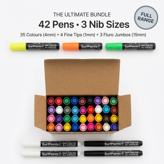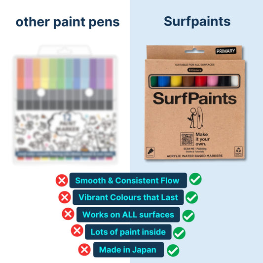 SurfPaints unique features include a 4mm & 1mm reversible nib for versatile art strokes, and a specially formulated acrylic blend from Japan designed for vibrant, long-lasting, and smooth application on any surface. With a strong surf culture, we’ve expanded our reach, embracing the broader art community with products that promise reliability, versatility, and excellence in every stroke.